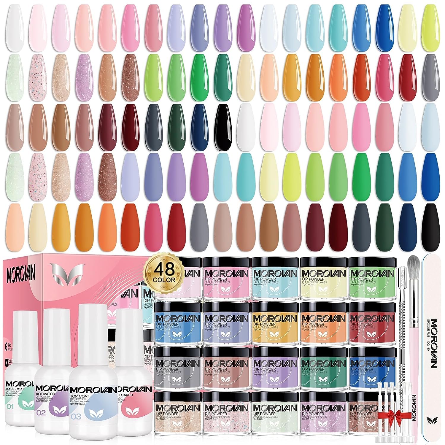 - 💙Salon Quality & Healthy Formula: Morovan dip powder nail kit is made of excellent raw materials, no odor, will not cause harm to human health. Nail dip powder kit is unrivaled shiny and vibrant, non-yellowing, and superb adhesion. Nail powder dip kit has most fashionable style colors, full but natural-looking, lightweight and breathable. Enable you to experience salon quality even at home with powder nail dipping kit.
