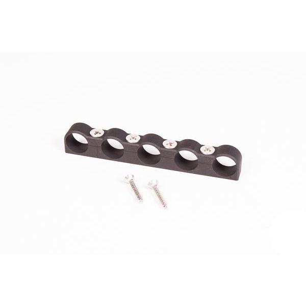 Anodized black billet aluminum clamp used for securing -6AN hoses, wire harnesses, etc. Includes all stainless hardware (4 bolts and 2 sheet metal screws). Each of the 5 inner diameters (ID) are 9/16" (0.563inch or 14.3mm).