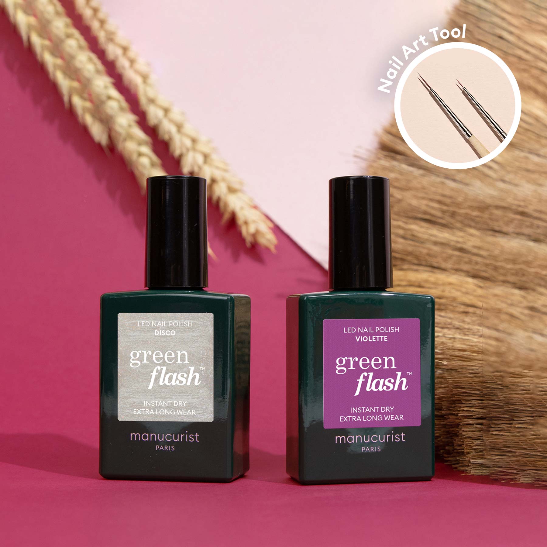 Brushes at the ready! This set contains all the products you need to create the Arty Shiny Summer nail art in our Summer Love collection: 2 Green Flash? or Green colors (Disco, Violette) + 1 Nail Art Brush.