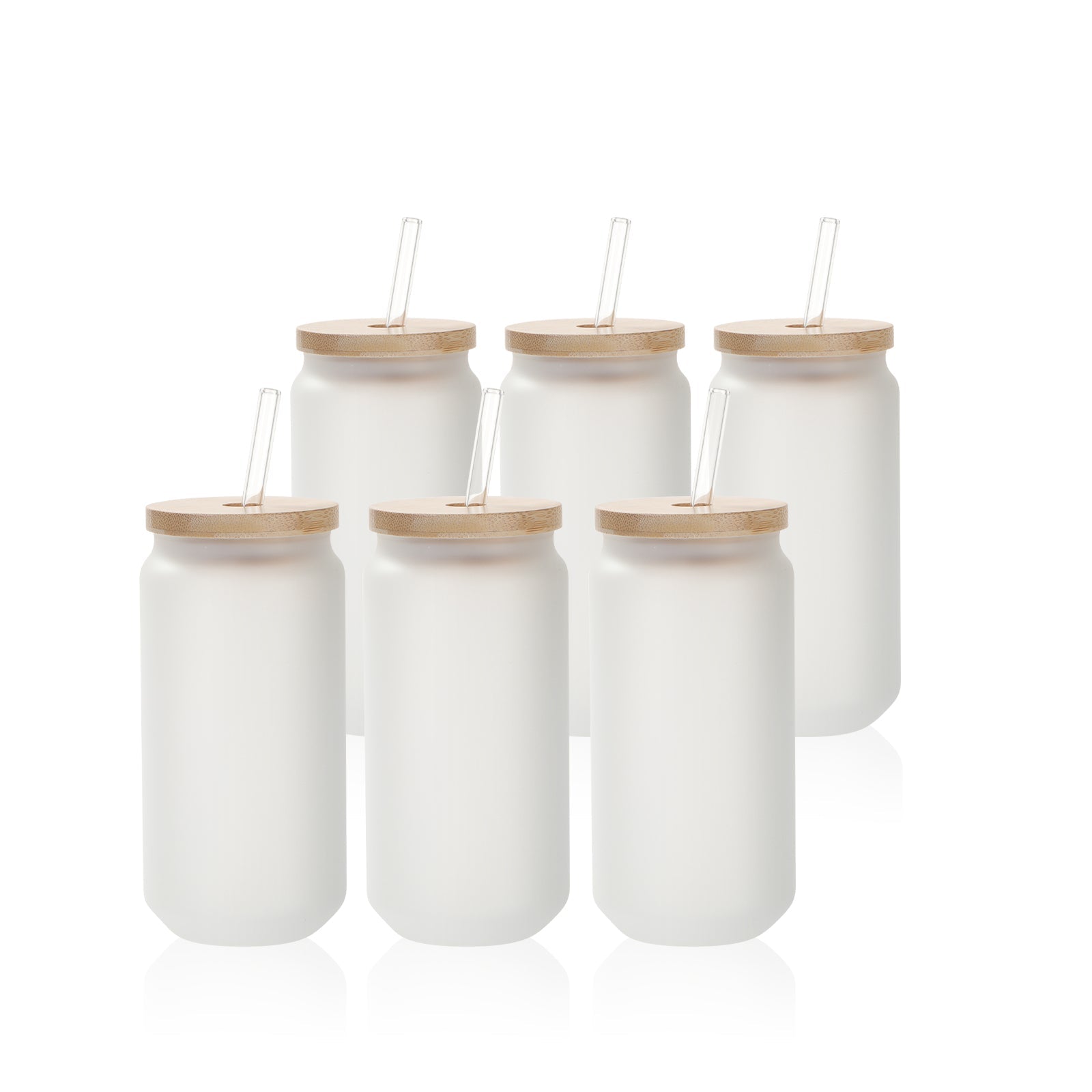 Sublimation Glass Beer Can Frosted White or Clear with Bamboo Lid and Glass Straw 18 OZ 6 Pack