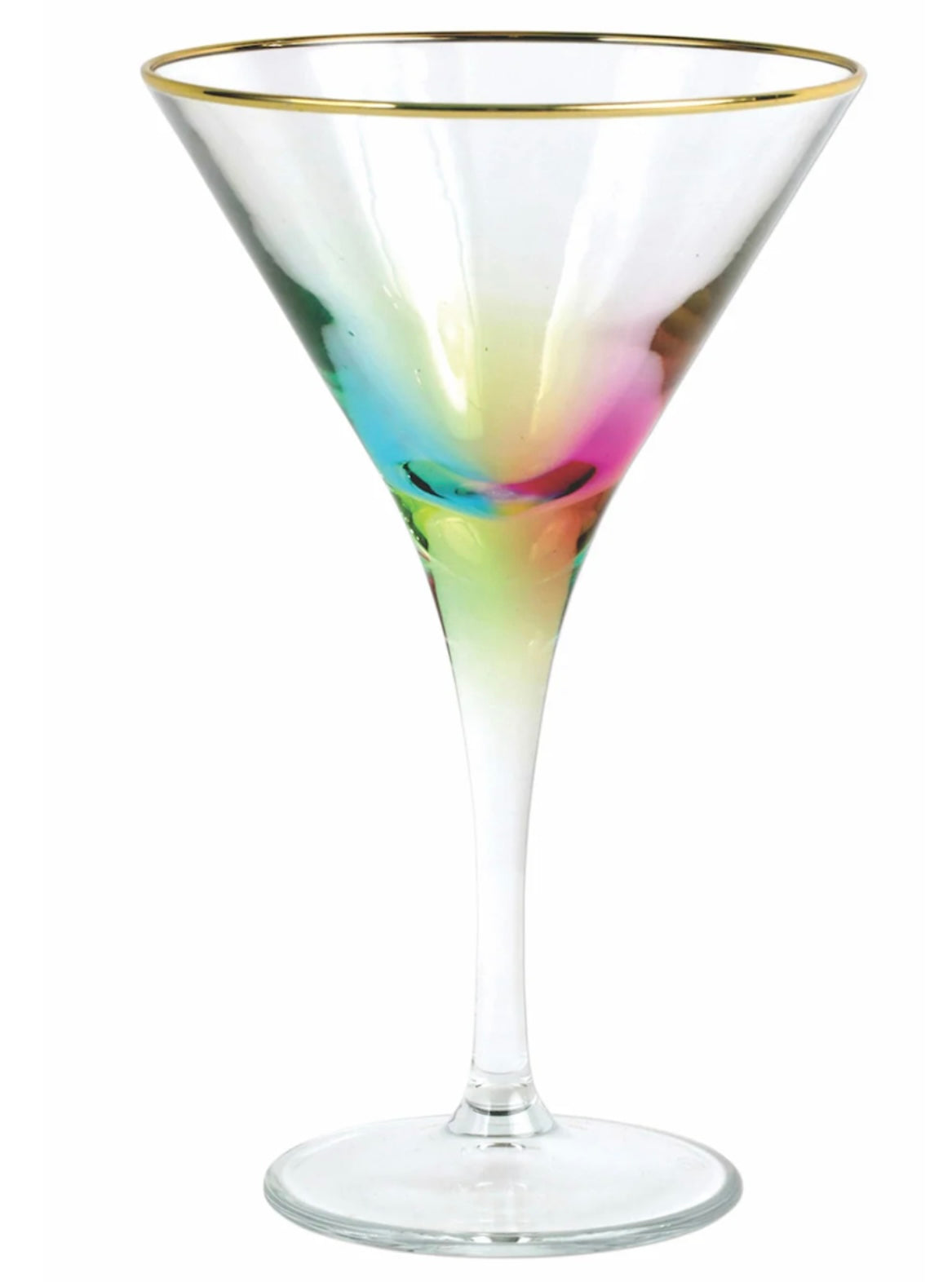 Add sparkle to any setting with a gilded gold rim and varied colored glass that refracts light on the Rainbow Martini Glass.